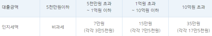 인지세란 인지세법에 따라 대출 약정시 납부하는 세금으로 아래 대출금액에 따라 신청인과 은행이 각각 50%씩 부담합니다.
