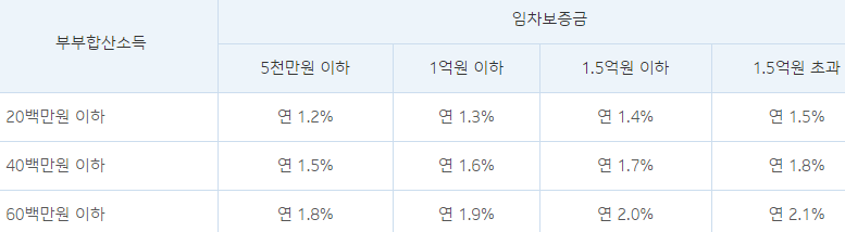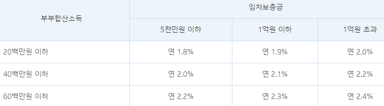 - 대출산청인과 배우자의 합산 총 소득이 5천만원 이하인 분 단 신혼가구,혁신도시 이전 공공기관 종사자,타지역으로 이주하는 재개발 구역 내 세입자는 6천만원 이하