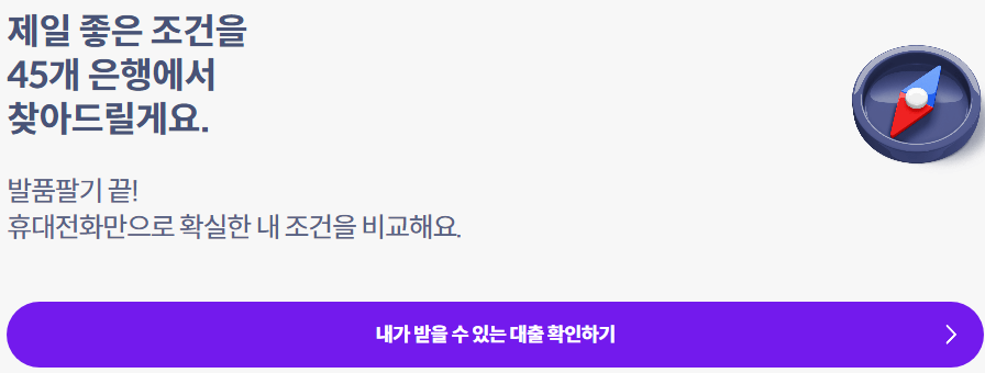 이 상품은 45개 은행에서 한번에 대출 비교 가능한 금융상품만매 대리 중개업자로 한번에 비교하여 비상금대출 금리 및 한도가 나오는데 그 중 제일 금리가 좋은 상품을 골라 실행하셔도 됩니다.