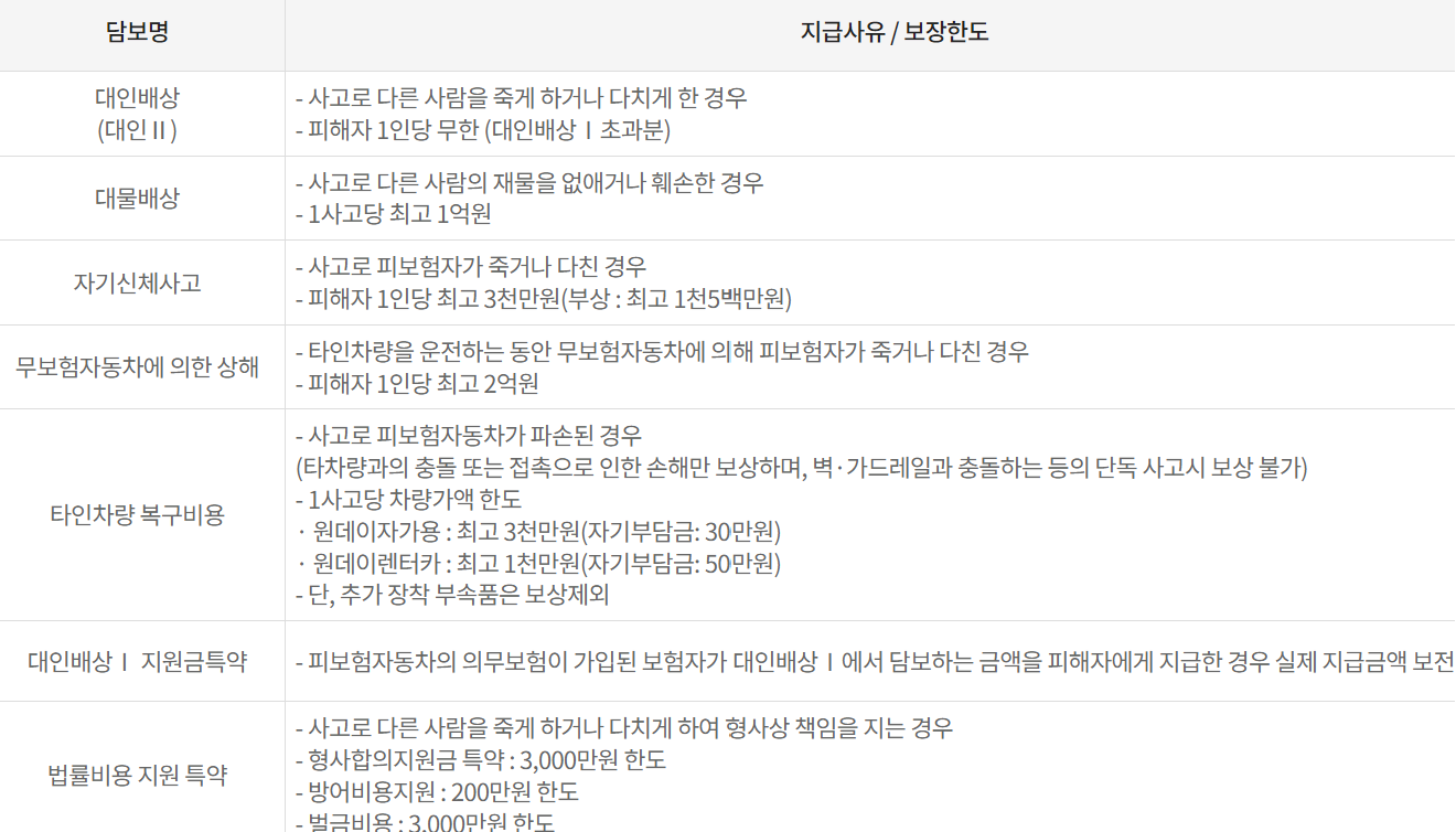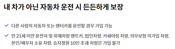 - 보장 내용이 일반 자동차보험보다 제한될 수 있습니다.