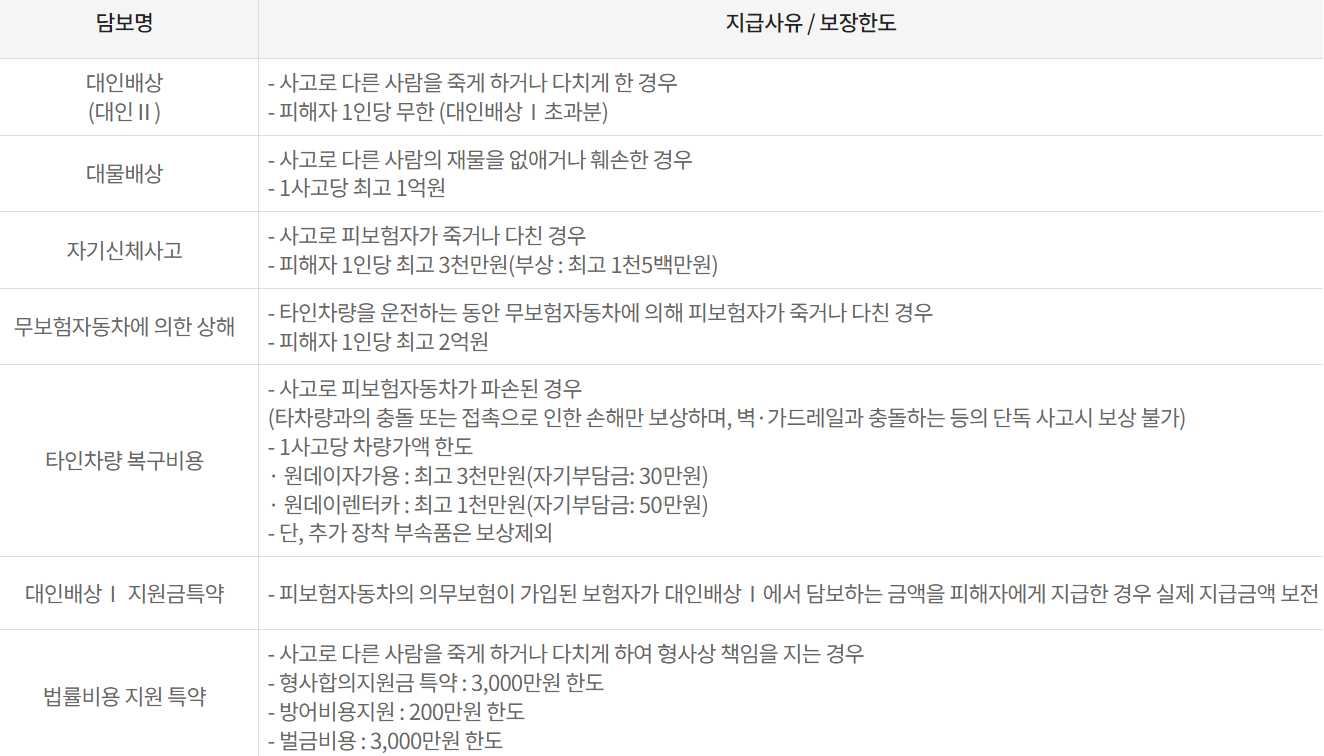 - 보장 내용이 일반 자동차보험보다 제한될 수 있습니다.