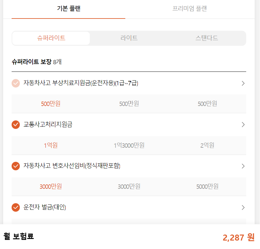 보험료는 프리미엄 플랜, 기본플랜이 있으며 기본플랜은 그 안에 더 작은 보장을 하면서 보험료가 저렴한 슈퍼라이트 플랜까지 있습니다.