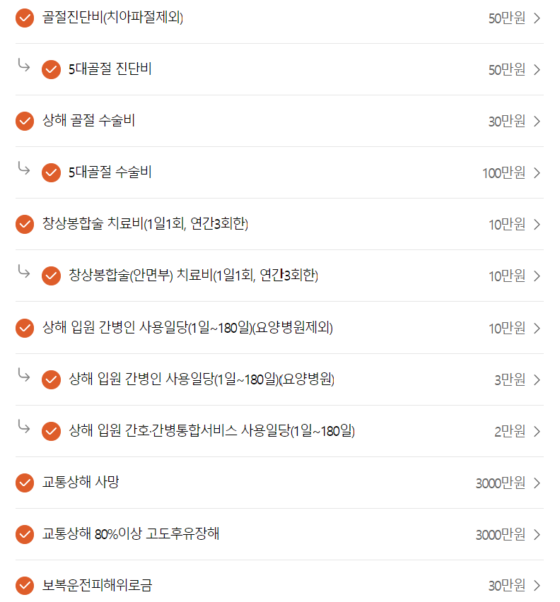 아래의 보장내용은 기본계약 + 선택계약으로 이루어져 있으며, 보장 플랜에 따라 다르게 적용됩니다.
