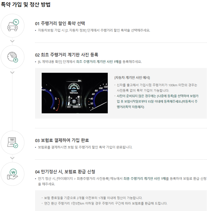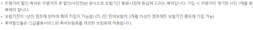 - 특약가입 시 주행거리는 별도로 선택하지 않으며, 보험종료 후 주행거리에 따라 환급 받으실 수 있습니다.