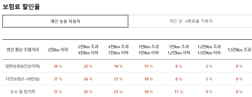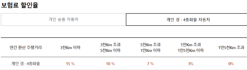 - 연간 환산 주행거리가 1만5천km 이하인 경우 보험료 할인혜택을 받으실 수 있습니다.