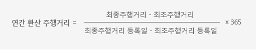 연간 주행거리 계산식 : (최종 등록 주행거리 - 최초 등록 주행거리)/(최종 주행거리 등록일 - 최초 주행거리 등록일)*365