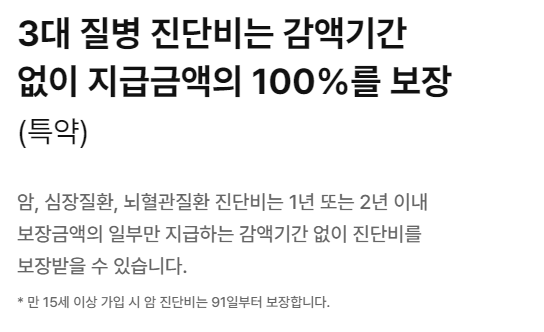 | 암진단비(유사암제외) | 암(유사암제외)으로 진단 확정 시 (최초 1회한) ※ 보험계약일 기준으로 15세 이상인 경우 암보장개시일은 계약일로부터 90일이 지난 날의 다음 날입니다. |