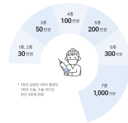 | 수술비(1~7종, 연간 3회한)[질병] | 질병의 직접적인 치료를 목적으로 약관에서 정한 1~7종 수술을 받은 경우 ※ 1회의 입원당 또는 1회의 통원당 1회의 수술에 한하여 보장하며, 하나의 수술 코드당 연간 3회에 한하여 보장 ※ 동일한 수술코드에 대한 보험금 지급은 직전 퇴원/통원일의 다음날부터 다음 입원일 또는 통원일까지 30일이 경과해야 함 |