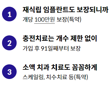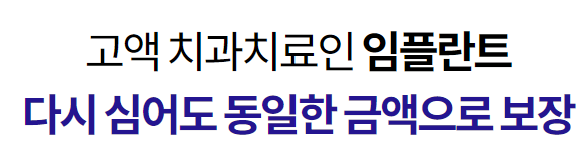 *재식립 임플란트의 경우 보험기간 중 임플란트 치료보험금 지급사유가 발생하고, 해당 영구치의 임플란트 치료일로부터 1년이 지난 다음 날 부터 보장, 동일부위 당 최초 1회 한도입니다.
