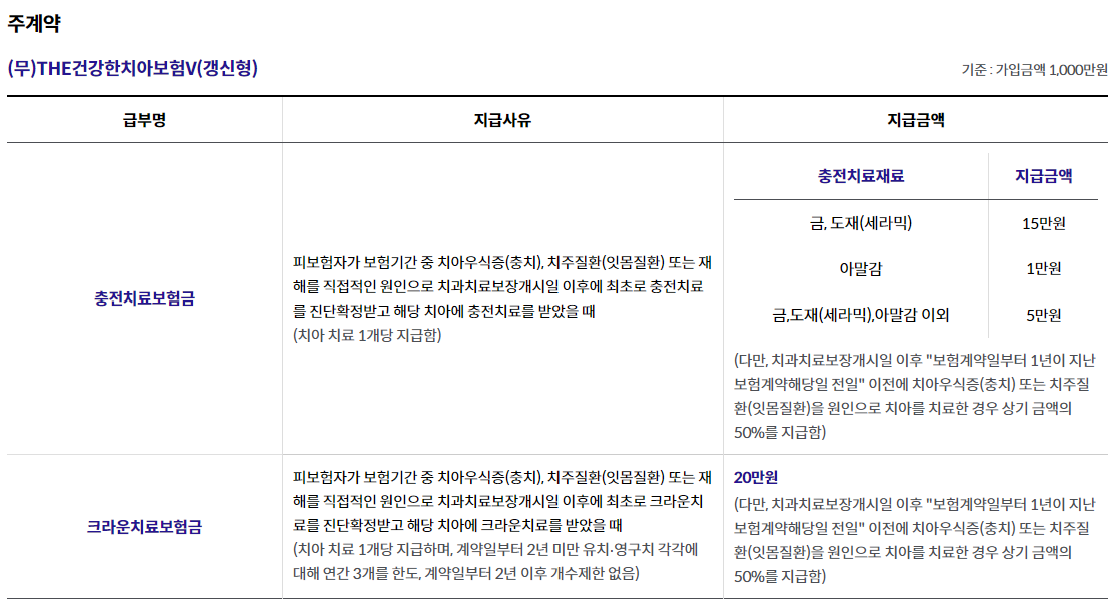 *충전/크라운치료는 보험기간 중 치아우식증(충치), 치주질환(잇몸질환), 또는 재해를 직접적인 원인으로