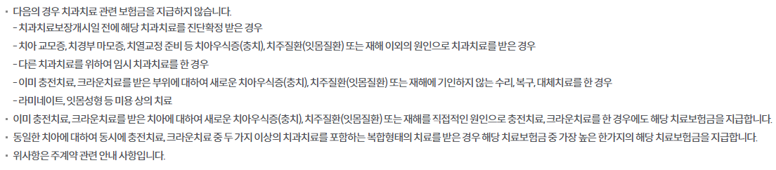 6. 동일한 치아에 대하여 동시에 충전치료, 크라운치료 중 두 가지 이상의 치과치료를 포함하는 복합형태의 치료를 받은 경우 해당 치료보험금 중 가장 높은 한가지의 해당 치료보험금을 지급합니다.
