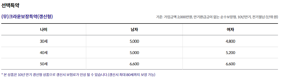 주계약 1,000만원, (무)크라운보장특약(갱신형) 2,000만원, 가입 후 91부터 보장