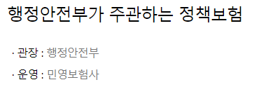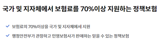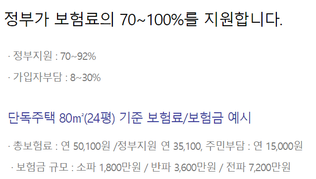 행정안전부가 관장하고 민영보험사가 운영하는 정책보험으로서 보험가입자가 부담하여야 하는 보험료의 일부를 국가 및 지자체에서 보조함으로써 국민은 저렴한 보험료로 예기치 못한 풍수해(태풍,홍수,호우,해일,강풍,풍랑,대설,지진)에 대해 스스로 대처할 수 있도록 하는 선진국형 재난관리제도입니다.
