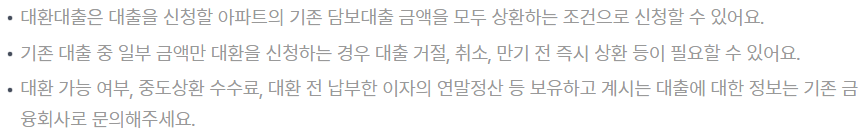 - 대출을 신청할 아파트로 받은 기존 담보대출 금액을 전액 상환하는 조건으로 대출 갈아타기(대환대출)를 신청할 수 있어요. 기존 대출금액 중 일부만 대출 갈아타기(대환대출)를 신청할 경우 대출 취소, 거절, 대출 만기 전 즉시 상환 등이 될 수 있어요.