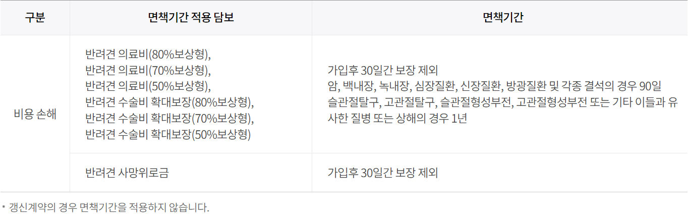 - 반려견 사망위로금 특약: 보험기간 중 반려견 사망 시, 사망위로금 지급(단, 가입 후 30일 이후 보장 개시되며 반려견 12세까지 보장)