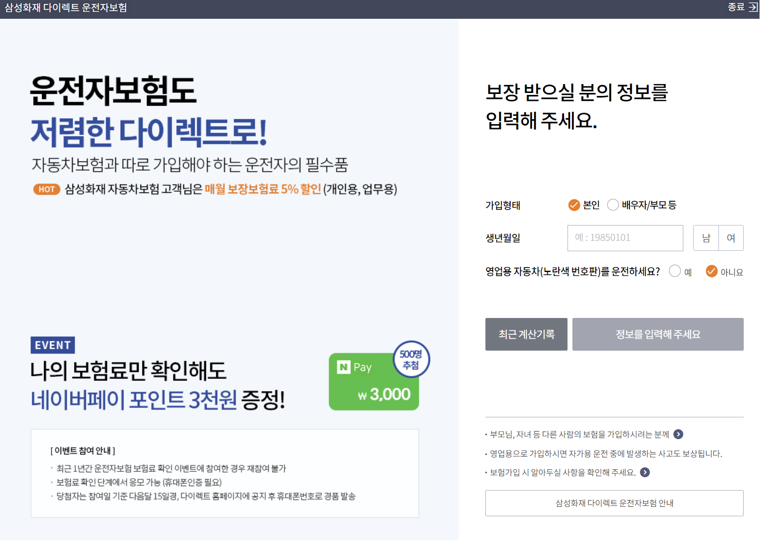 - 자동차보험은 삼성화재가 아니여도, 운전자보험만 삼성화재 다이렉트라면 이용 가능