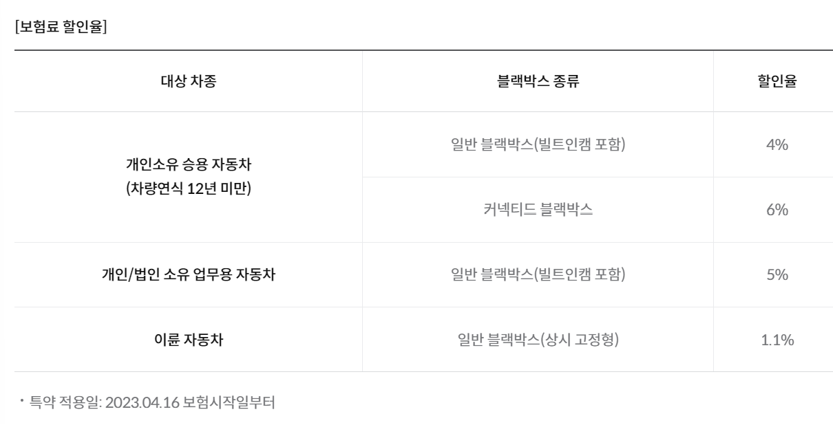 블랙박스 할인 특약은 긴급출동서비스와 특약 보험료를 제외한 보험료에 적용됩니다.