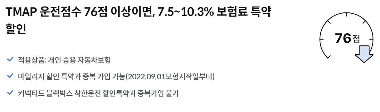 - TMAP 착한운전 할인 특약은 긴급출동서비스와 특약 보험료를 제외한 보험료에 적용됩니다.