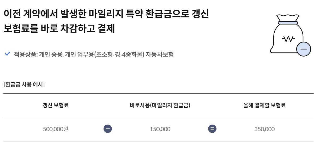 - 이전 계약과 올해 계약의 계약자와 자동차번호가 같은 경우(달라진 경우는 서비스 이용 불가)마일리지 환급금을 바로 사용하지 않거나 사용할 수 없는 경우, 보험 가입 시 등록한 계좌로 환급해 드립니다.
