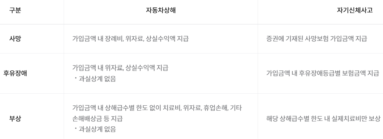 - 자동차상해는 자기신체사고보다 충실한 보상, 보험금을 과실상계 없이 보상합니다.
