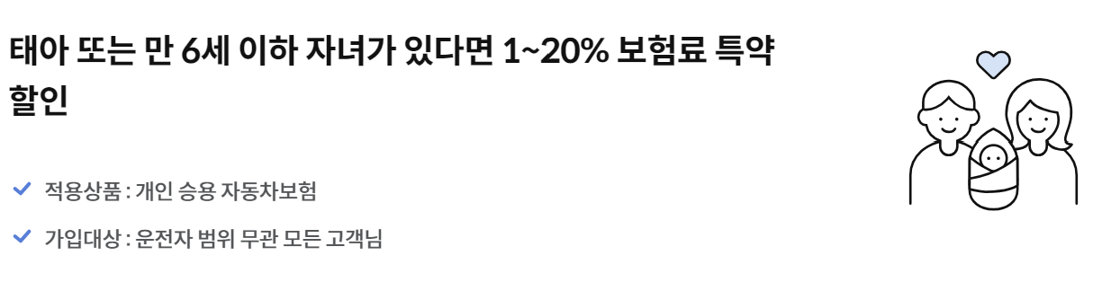 - 자녀사랑 할인 특약은 긴급출동서비스와 특약 보험료를 제외한 보험료에 적용됩니다.
