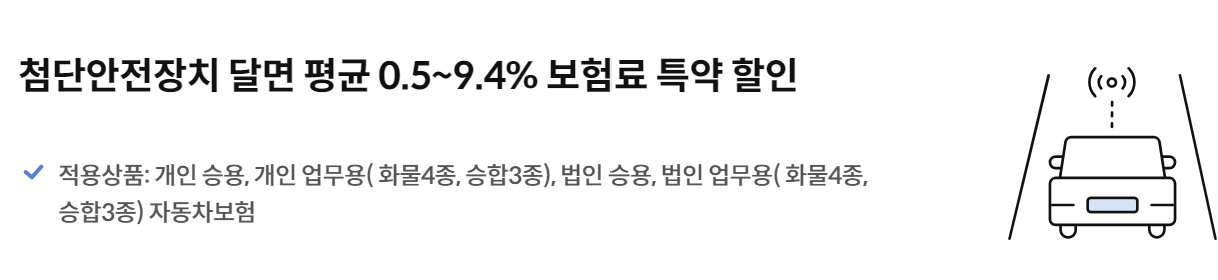 - 첨단안전장치 보험료 할인은 긴급출동서비스와 특약 보험료를 제외한 보험료에 적용됩니다.