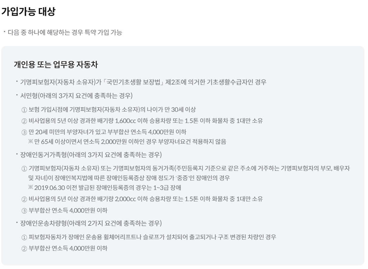 (단, 잔여 보험기간이 3개월 이상인 경우에만 보험기간 중도에 가입 가능) - 승합차, 법인용 자동차, 이륜차는 특약 가입이 제외됩니다.