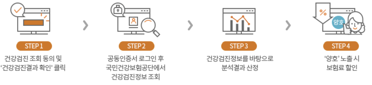 - 건강검진 결과통보서의 건강검진일이 '보험개시일 - 2년' 이전인 경우에는 할인 적용이 불가합니다.