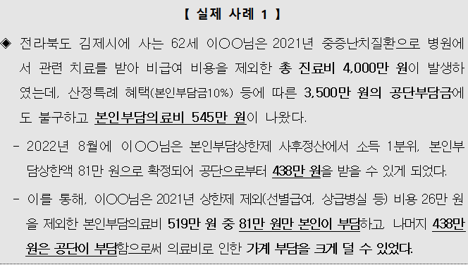 쉽게 한번 더 설명 드리자면 소득 분위에 따라 본인 부담 상한액이 정해지며, 정해진 의료비 보다 초과한 금액에 대해 국민건강보험공단에서 대신 부담해줘서 이미 부담한 금액에 대해 환급을 받을 수 있는 제도입니다.