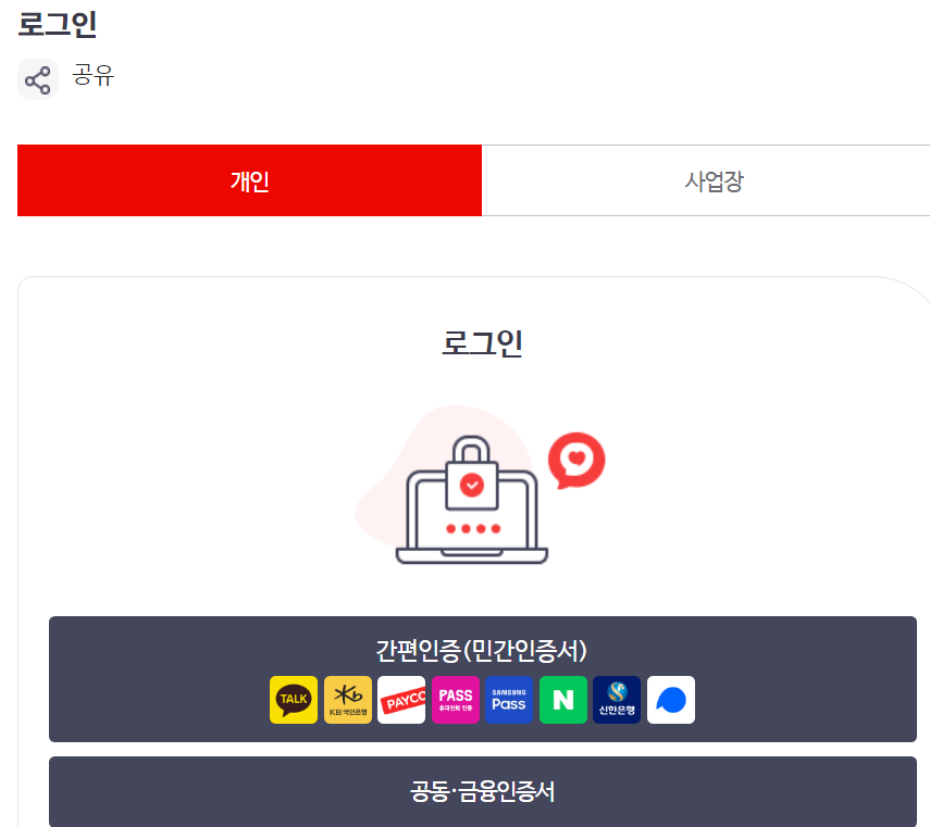 그 후 로그인을 하면 되는데 옛날에는 공동,금융인증서로만 가능했으나 요즘은 민간인증서를 통해서 간단하게 간편인증을 할 수 있습니다.