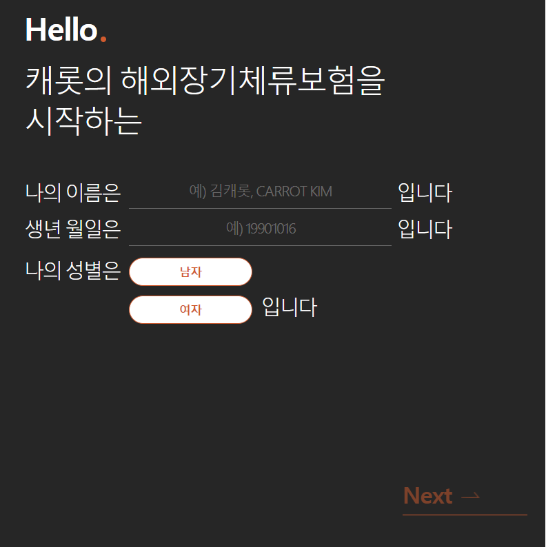 보험료 조회방법은 간단합니다. 이름, 생년월일 성별을 입력 후 Next를 클릭합니다.