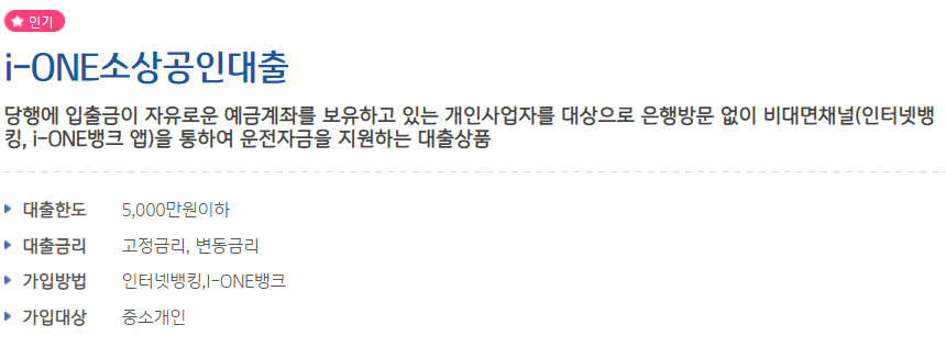 기업은행 개인사업자대출의 상품명은 'i-one 소상공인대출' 로 기업은행에 입출금 예금계좌를 보유하고 있는 개인사업자를 대상으로 은행 방문 없이 비대면으로 운전자금을 지원하는 대출상품입니다.