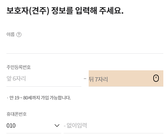 보험료 조회방법은 간단합니다. 우선 이름, 생년월일, 반려견 종류, 반려견 성별을 입력합니다.