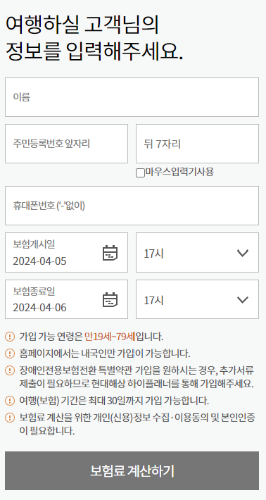 이름 주민번호, 휴대폰 번호 , 여행 날짜 입력 후 보험료 계산하기를 클릭합니다.