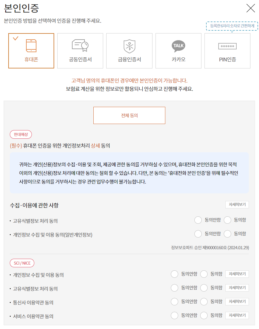 보험료 계산을 위한 개인정보 처리에 동의를 합니다. 필수 사항만 동의하셔도 됩니다.