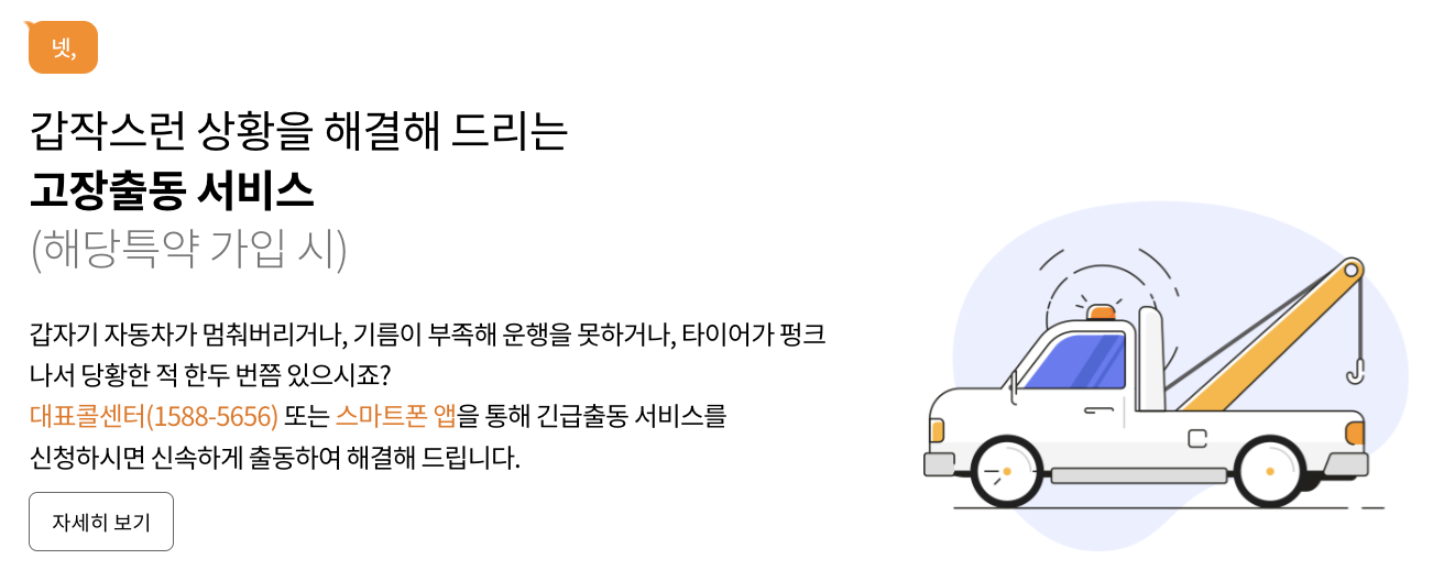 - 긴급견인 서비스: 사고 또는 고장으로 차량 운행이 불가능한 경우, 가까운 정비소까지 견인해 드립니다.