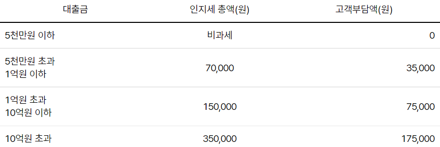 인지세란 대출 약정 시 대출금액에 따라 내는 세금으로 , 고객과 은행이 각각 50%씩 부담합니다.
