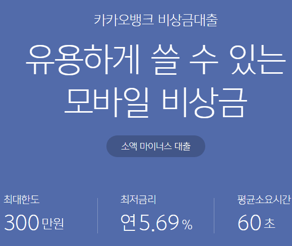 소액 마이너스 대출로 카카오뱅크는 인터넷은행으로 영업점을 두지 않는 대신 금리가 저렴한 은행으로 유명하죠 직업 및 소득에 관계없이 카카오뱅크 내규 심사 기준만 통과하면 되며 보통 통과 가능하며, 비상금대출 조건에 부합하지 못한다면 금리가 그 보다 조금 더 비싼 중신용비상금대출도 있으니 걱정하지마세요
